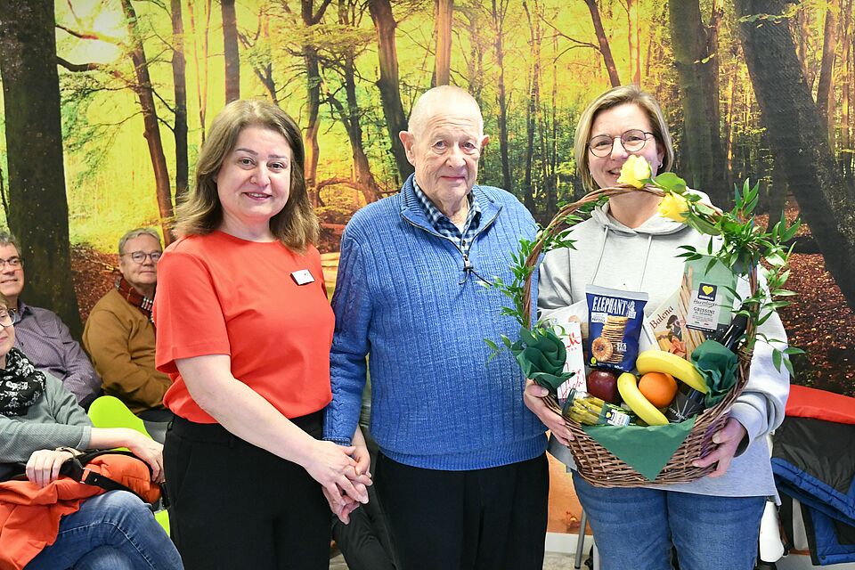 Ewald Betting begleitete die Bocholter Filmabende im Quartierstreff Bocholt-Südwest an der Bärendorfstraße 24. Am letzten Filmabend erhielt er von den beiden DRK-Quartiersarbeiterinnen Glades Tchiri und Heidrun Rinke einen Frühstückskorb für seine ehrenamtliche Mitarbeit.