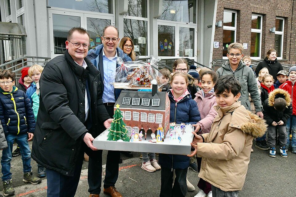 Isselburg-Anholt (drk-press). Anholt erhält bis zum 3. Dezember eine Eisbahn beim Adventsmarkt. Und das fanden die Kinder der vom Roten Kreuz im Kreis Borken betriebenen Offenen Ganztagsschule (OGS) so toll, dass sie Bürgermeister Michael Carbanje naturgetreu das Isselburger Rathaus nachbauten. Der Bürgermeister freute sich bei der Übergabe ganz besonders: „Das ist eine tolle Überraschung, zumal die beteiligten Personen alle dichtgehalten haben und ich nichts von dem Geschenk wusste.“