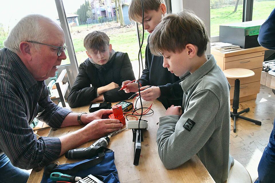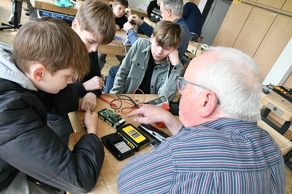 “Unser Wahlpflichtkurs Naturwissenschaft/Recycling mit 15 Schülerinnen und Schülern der siebten Klasse war von Anfang an unglaublich motiviert”, sagte Lehrerin Daniela Kasche, als das Repair-Team mit Hans Zaksek von der Freiwilligenagentur mit seinen Werkzeugkoffern und technischen Utensilien in einem der Technikräume der Gesamtschule anrückte. 1400 junge Menschen besuchen die Jodocus-Nünning-Gesamtschule.