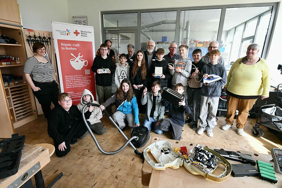 Oft seien nur einfache Säuberungsarbeiten notwendig, hieß es; dies betreffe oft Staubsauger, die häufig nach erfolgter Reinigung wieder einwandfrei funktionierten. “Wir erklären den Schülern, wie repariert werden kann und den Hintergrund unserer erfolgreichen ehrenamtlichen Arbeit.” Zum Borkener Repair-Café-Team gehören mittlerweile mehr als 30 Freiwillige, die Spaß an der Sache haben. Immer am ersten Freitag im Monat wird von 15 bis 18 Uhr im Rotkreuz-Zentrum an der Röntgenstraße 6 in Borken repariert – mit einer überdurchschnittlich hohen Reparaturquote von 75 bis 80 Prozent.