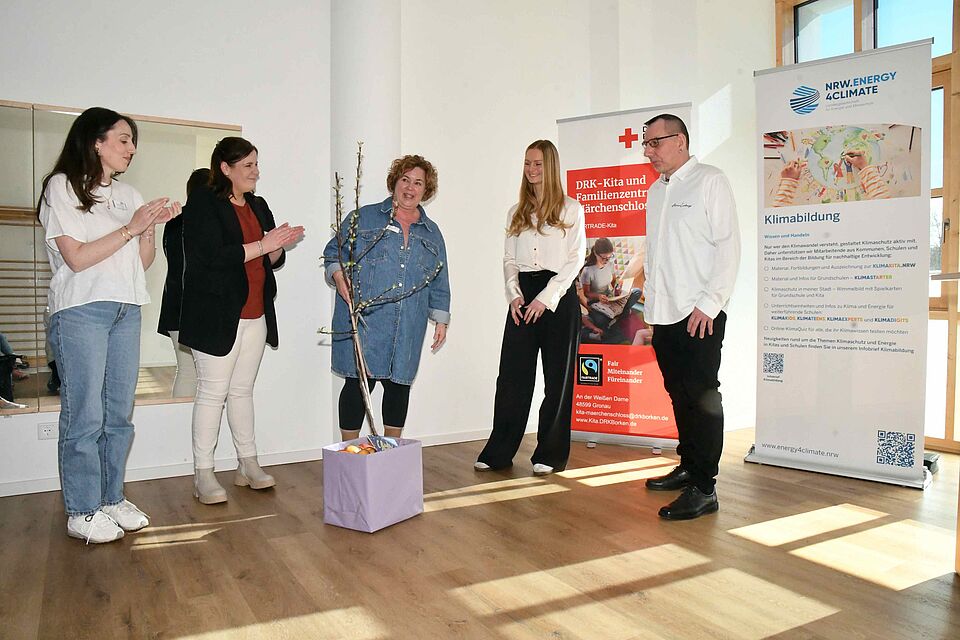 Gronau/Kreis Borken (drk-press). Hohe Auszeichnung für eine Kita des Roten Kreuzes im Kreis Borken: Die DRK-Kita und Familienzentrum “Märchenschloss” in Gronau ist jetzt Klima-Kita des Landes NRW. Die Zertifizierung wurde in einer kleinen Feierstunde mit Kindern, Eltern, Gästen sowie der Vertreterin der Stadt Gronau, der Beigeordneten Christiane Schrader, übergeben. Dazu war Monika Bröhl, Projektmanagerin Klimabildung der Landesgesellschaft für Energie und Klimaschutz, NRW.Energy4Climate, von Düsseldorf nach Gronau gekommen.