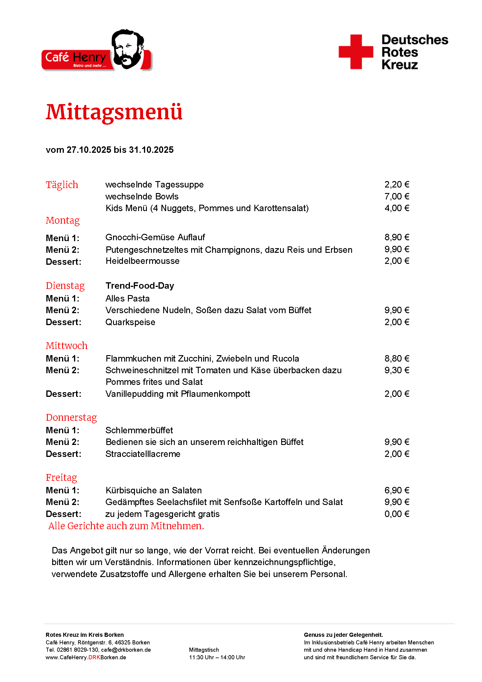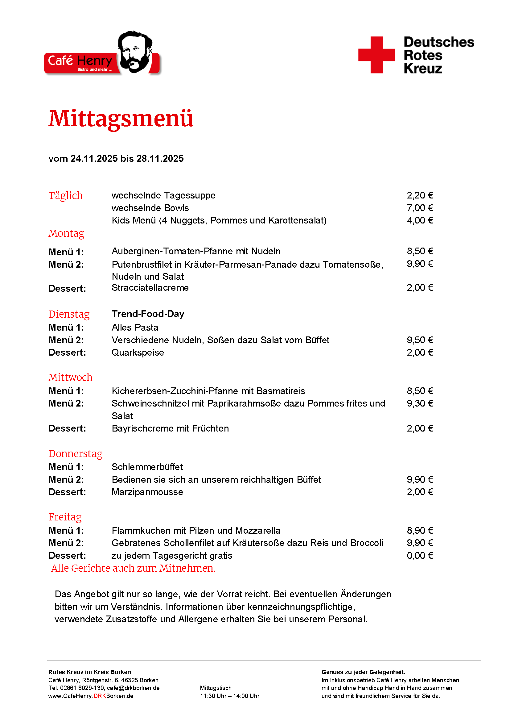Das Angebot gilt nur solange, wie der Vorrat reicht. Bei eventuellen Änderungen bitten wir um Verständnis. Informationen über kennzeichnungspflichtige, verwendete Zusatzstoffe und Allergene erhalten Sie bei unserem Personal.